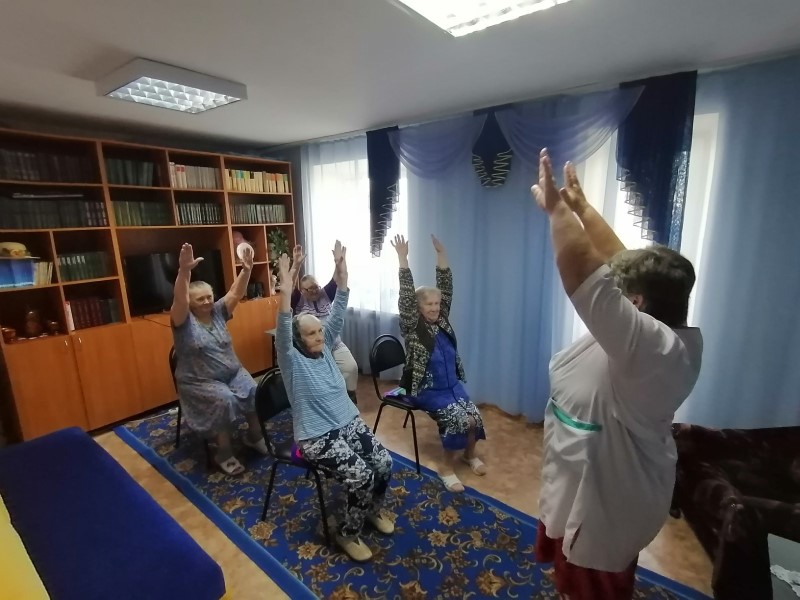 В отделении «Специализированный жилой дом для граждан пожилого возраста и инвалидов» прошел фитнес-час «На зарядку становись». Фельдшер отделения Беляева М.И. познакомила участников мероприятия с физкультурным комплексом «УПРАЖНЕНИЯ ДЛЯ ДОЛГОЛЕТИЯ».
