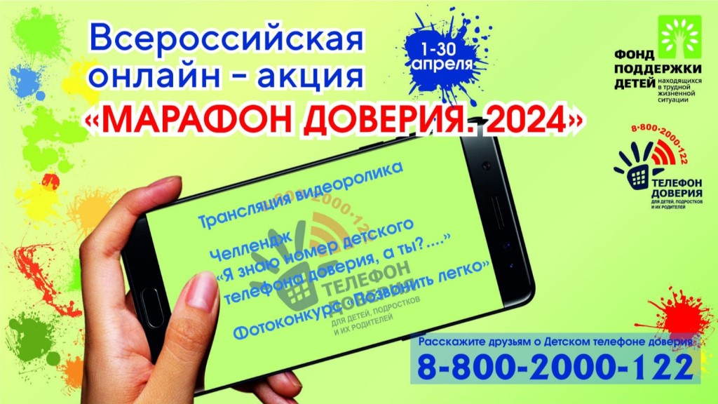 Цель Всероссийской онлайн-акции «Марафон доверия. 2024» - повышение информированности детей и родителей о возможности получения экстренной психологической помощи по детскому телефону доверия 8 800 200 122.