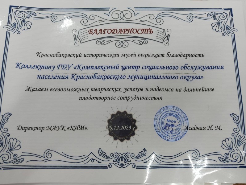 Краснобаковский исторический музей отметил свое 55-летие. На это торжественное мероприятие был приглашен ГБУ «КЦСОН Краснобаковского муниципального округа». В адрес музея на сцене Районного центра досуга и кино звучали поздравления, добрые пожелания, прекрасные песни. Коллективу Учреждения была вручена благодарность за тесное сотрудничество с музеем.