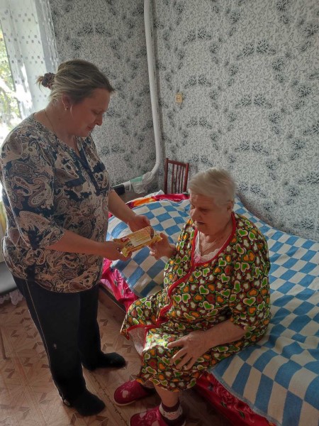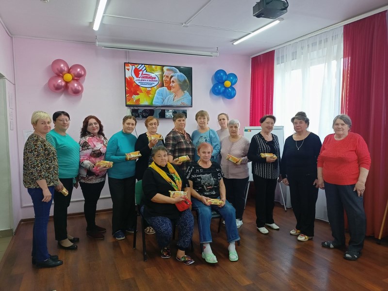 Работники отделения социально-бытового обслуживания на дому №7 поздравляют обслуживаемых с Днем пожилых людей и вручают сладкие подарки