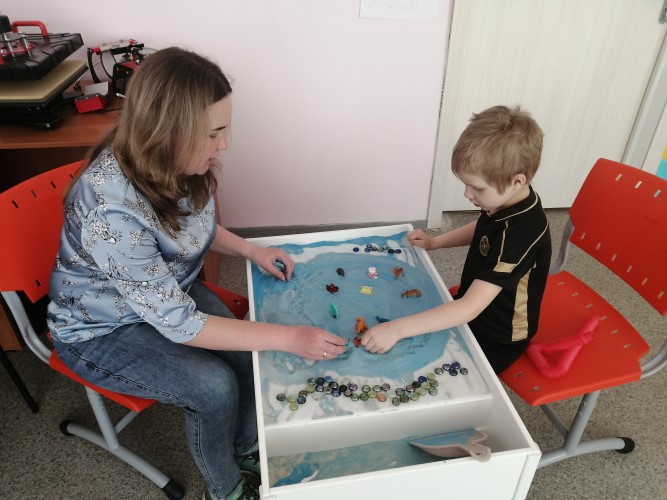 В рамках месячника распространения информации об аутизме психолог Алимова С.В пригласила детей с РАС в волшебный песочный мир, и показала много интересных игр, с помощью которых дети окунулись в сказку. Взаимодействие с песком, как и всякая игра, способствует моторному и когнитивному развитию ребенка. Игры с песком – это очень приятное и творческое занятие, практически всегда связанное с созиданием чего-то. Взаимодействие с песком само по себе обладает успокаивающим эффектом, способствует оптимизации и стабилизации эмоционального состояния.