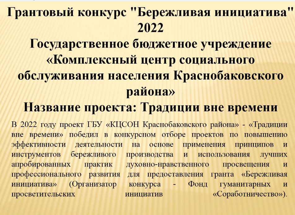 В рамках проекта с декабря по март для детей младшего школьного возраста прошли мероприятия, направленные на знакомство детей с культурным наследием Краснобаковского округа. Был проведен комплекс занятий, включающий в себя кукольные спектакли «Рукавичка, «Под грибом»; беседы с детьми после представлений; видеоуроки об истории традиционных и государственных праздников России; конкурс детских рисунков на тему "Наша национальная одежда"; круглый стол с родителями о важности воспитания детей в культурной отечественной традиции; 4 мастер-класса по созданию традиционной народной куклы.