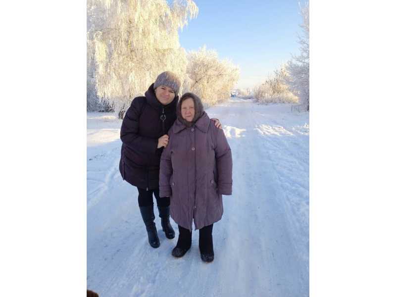 А на улице настоящая зима. Всё побелело вокруг. Какая красота! Супруга Савинова Римма Ивановна и Николай Николаевич, из с. Саитовки на прогулке с социальным работником.