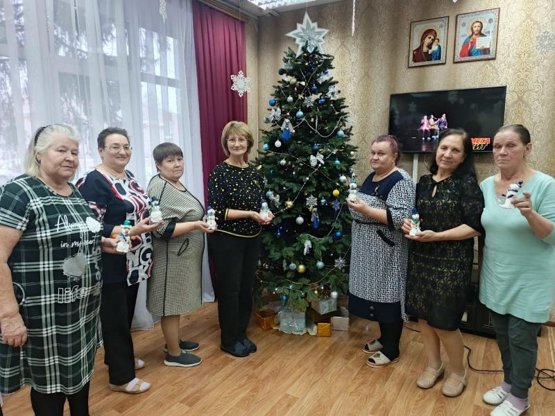 В отделении дневного пребывания отдыхающие смастерили симпатичного снеговика из такого простого и дешёвого материала как вата.