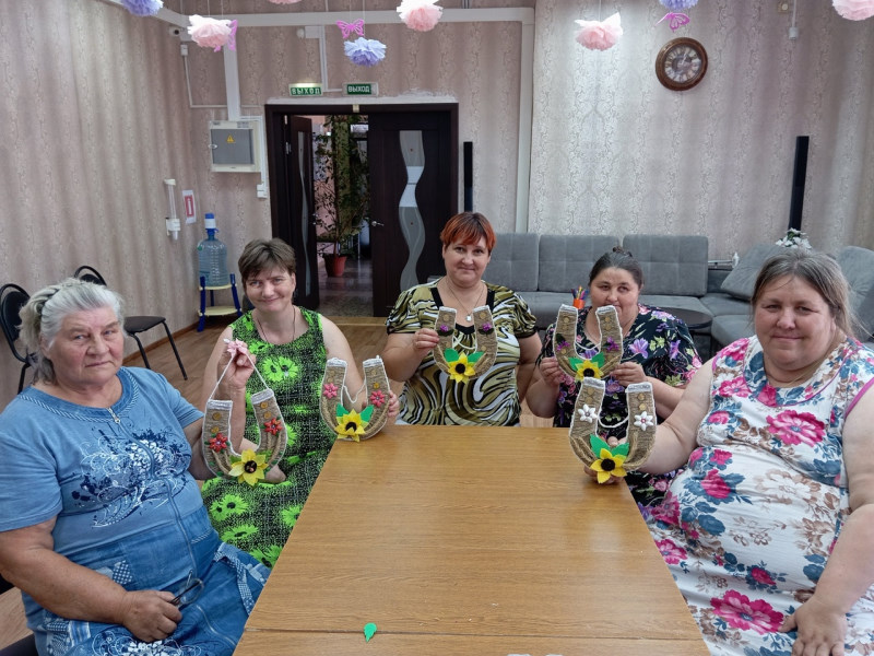 Отдыхающие отделения дневного пребывания на кружке "Волшебный клубочек" изготовили оберег в виде подковы