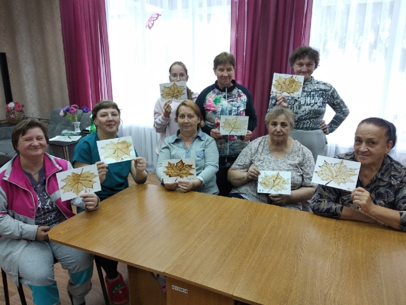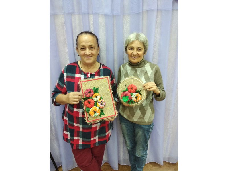 Отдыхающие отделения дневного пребывания на кружке «Волшебный клубочек» изготовили панно с текстильными тыквами.
