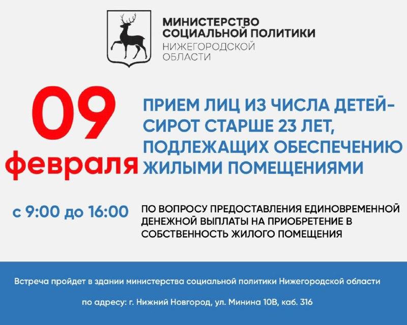 Сообщаем, что 9 февраля в министерстве социальной политики Нижегородской области пройдет прием граждан по вопросу обеспечения жильем детей-сирот старше 23 лет.