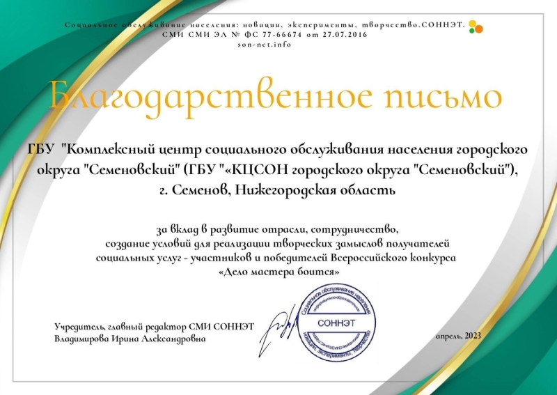 Наше учреждение приняло участие во Всероссийском конкурсе "Дело мастера боится", организованном информационно-образовательным электронным журналом для работников социальной сферы СОННЭТ.