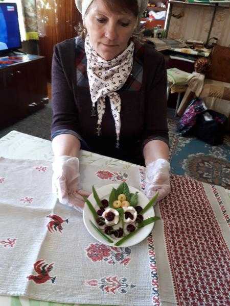 В отделении социально-бытового обслуживания на дому №2 с. Алемаево и с. Смирново социальными работниками Людмилой Куренковой, Натальей Соколовой и Ириной Янаевой было проведено плановое занятие по кулинарной терапии с получателями социальных услуг Меньшовой Любовью Петровной, Хасатовой Натальей Асатиллоевной и Пищерковой Марией Ивановной  «Карвинг. Украшение праздничных блюд». В ходе занятия сделали украшения из варёных овощей и зелени для праздничного стола.